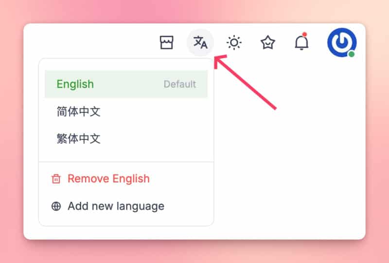 Language selection is under the navbar. Switch the content language, set a default, and add or remove languages.